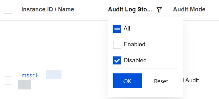 3. After selecting a region above, on the Audit Instance page, click Audit Log Storage Status and select the Disabled option to filter out instances with audit not enabled.