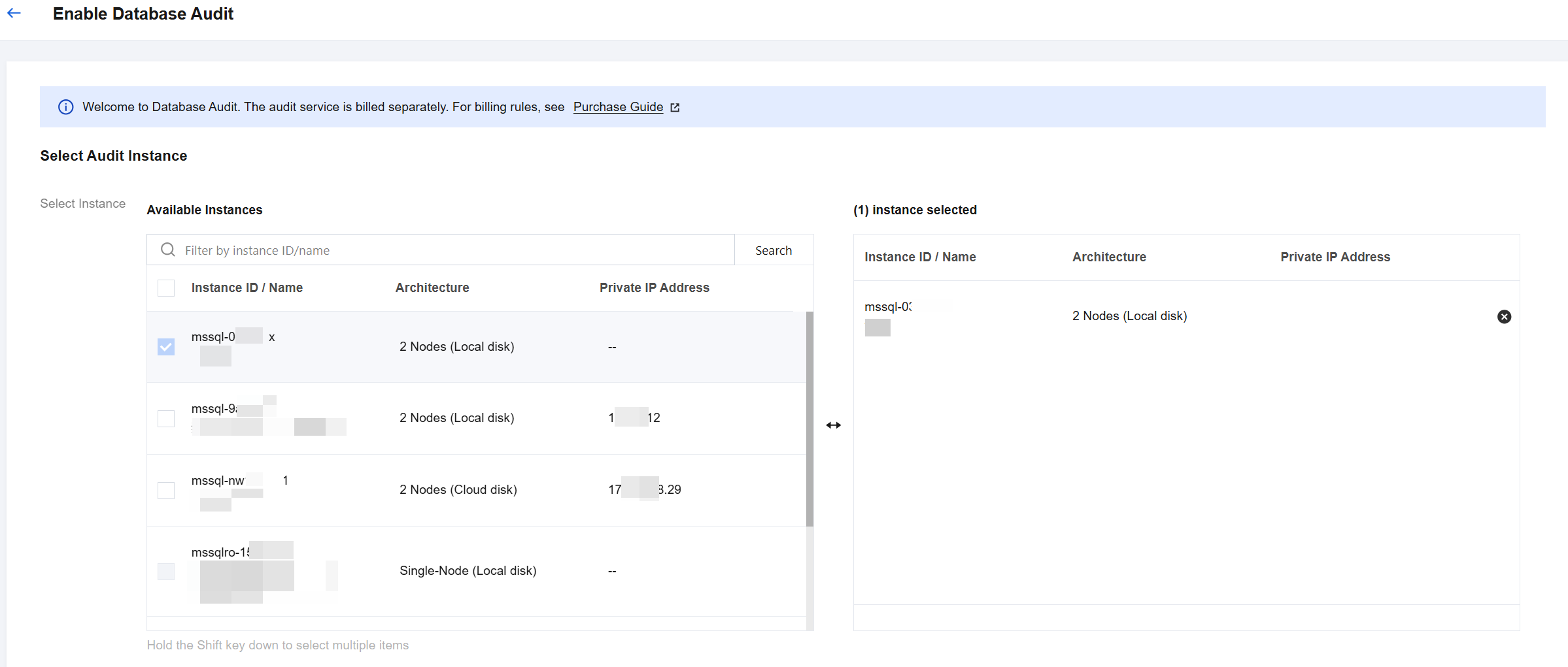 Batch enabling of audit services is supported. On the audit instance list page, select multiple target instances and click Enable Database Audit at the top to go to the setup page.