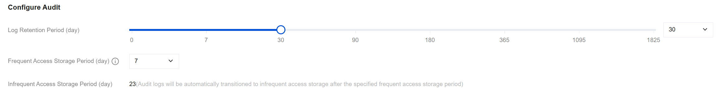 Frequent Access Storage Period | Frequent Access Storage represents ultra-high-performance storage media with excellent query performance. Unit: days. After the storage duration is set, audit data within the specified duration will be stored in Frequent Access Storage. Data exceeding the Frequent Access Storage duration will automatically transition to Infrequent Access Storage. Both storage types support identical audit capabilities and differ only in performance. For example: if the log retention period is set to 30 days and the Frequent Access Storage duration is set to 7 days, then the Infrequent Access Storage duration defaults to 23 days. |