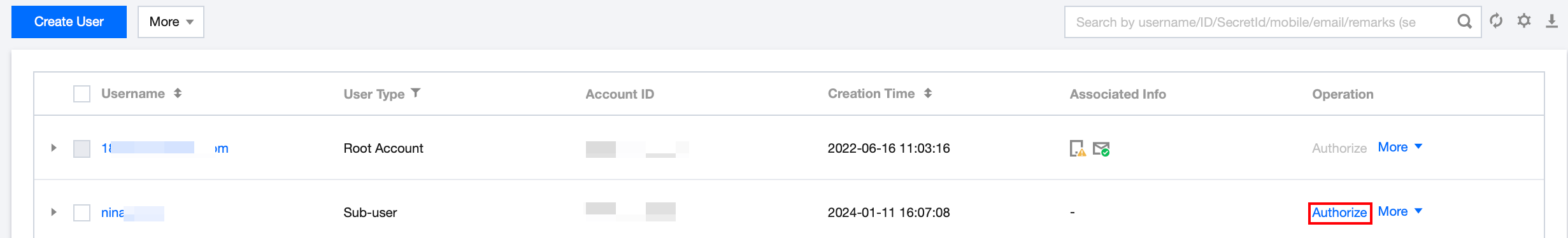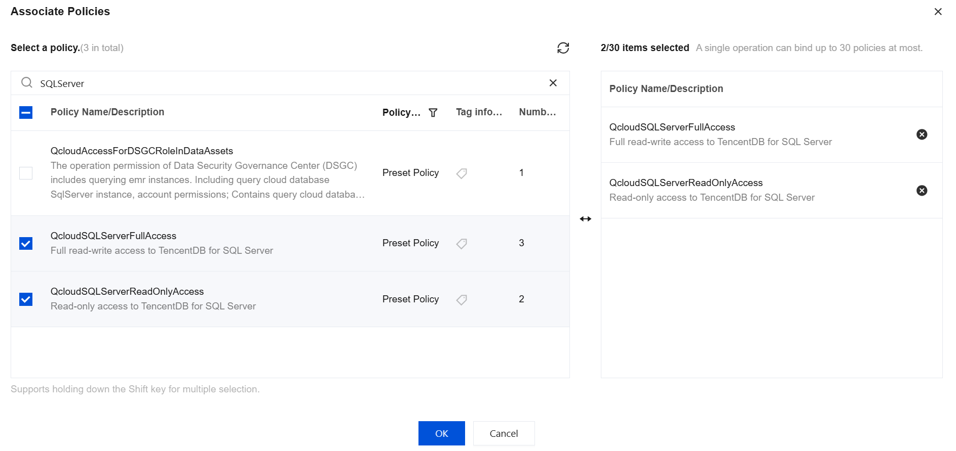 1. Log in to the CAM console as the primary account, select the corresponding sub-user in the user list, and click Authorize. 2. In the pop-up dialog box, select the QcloudSQLServerFullAccess TencentDB for SQL Server Full Read/Write Access Permissions or QcloudSQLServerReadOnlyAccess TencentDB for SQL Server Read-Only Access Permissions preset policy, click OK to complete the sub-user authorization.