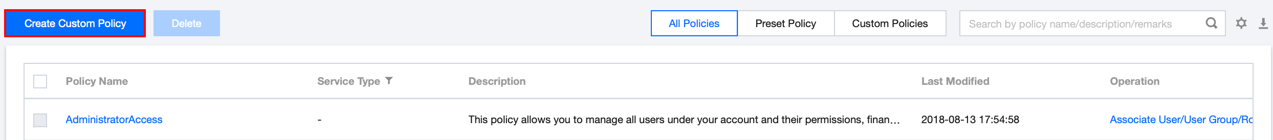 1. Log in to the CAM console as the primary account, navigate to the policy list, and click Create Custom Policy. 2. In the pop-up dialog box, select Create by Policy builder.