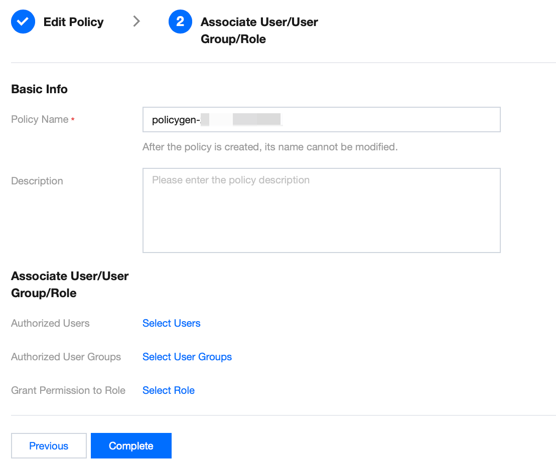 4. On the Associate Users/User Groups/Role page, enter "policy name" (such as SQLAuditFullAccess) and "description" according to naming conventions, then click Complete.