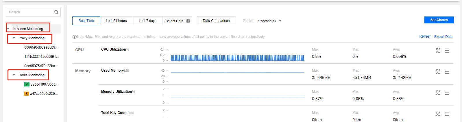 Latency | Average execution latency | Proxy node | latency_avg | ms | The average execution latency from the Proxy to the Redis Server. |