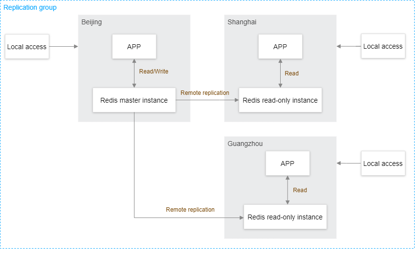 In the global replication scheme of Tencent Cloud Distributed Cache, a master instance is configured in a replication group, while read-only instances are deployed in multiple regions and replicate data from the master instance. The data version is based on the master instance, and the data consistency level is eventual consistency. This allows you to access data locally with a quicker response, better experience, higher data availability, and greater data security.