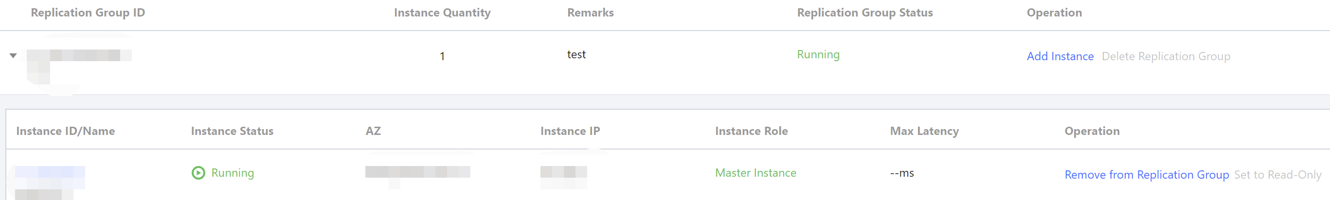 If there are instances in the replication group, you can choose to add a read-only instance. If you need to add a master instance, submit a ticket. 4. Return to the Distributed Cache- Global Replication page. In the replication group list, click before the name of the target replication group to show its instance list, where you can see the newly added instance.