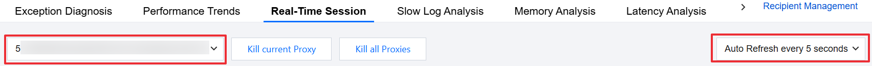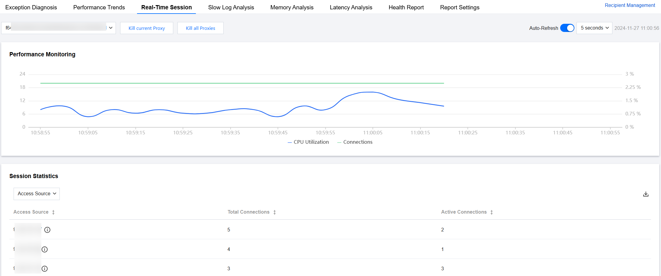 The real-time session feature focuses on two key metrics: the CPU utilization of the database instance's Proxy node and the number of client connections. It dynamically displays the trends of these metrics while continuously tracking data such as database sessions, access sources, and active connections. Additionally, it supports killing sessions for the current Proxy or all Proxy nodes.