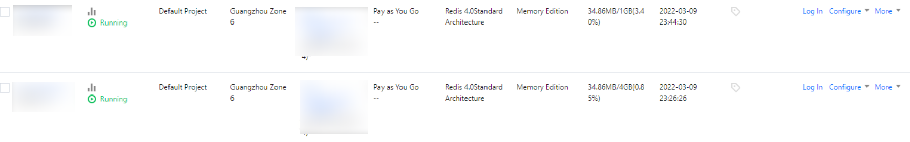 Operation | Click Log In to access the database through DMC. For directions, see Connecting to TencentDB for Redis® Instance. You can click Configure and then select an operation as needed. Specifically, you can select Expand Node or Reduce Node to expand or reduce the instance node memory, select Add Replica or Delete Replica to add or delete instance replicas, or select Add Shard or Delete Shard to add or delete shards in the cluster architecture respectively. For directions, see Changing Instance Specification. Choose More > Performance/Security to view the performance diagnosis report of the instance. For directions, see Performance Optimization Overview. Select More > Security Group to select the security group inbound rules again. For directions, see Configuring Security Group. For pay-as-you-go instances, select More > Terminate to return the instance and isolate the instance in the recycle bin. For directions, see Returning and Isolating Instance. Select More > Edit Tag to modify the tag key value of the instance. For directions, see Editing Instance Tag. |