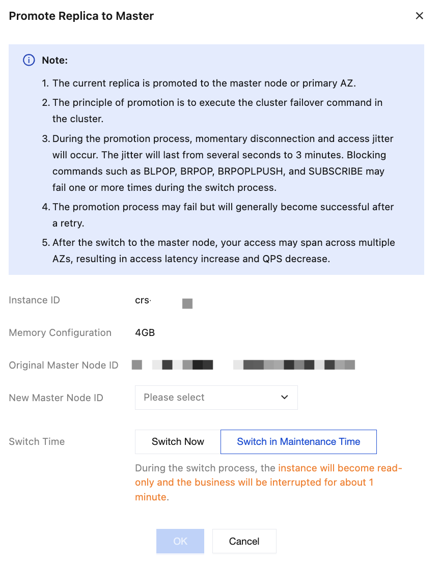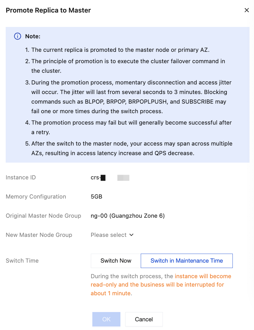 Switch Time | Select the time window for replica promotion to primary switchover. | Switch Now: This will immediately initiate the switchover task. Switch in Maintenance Time: that is, initiate the switchover task during the maintenance window. For related introduction and configuration of the maintenance window, see Set Maintenance Window. |