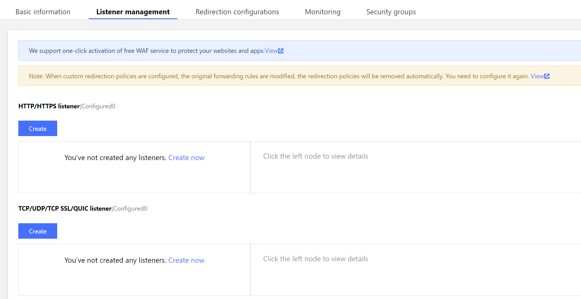 2.1 Log in to the CLB console, select a region, and click Instance ID in the instance management list to enter the instance management page. 2.2 On the instance management page, select the Listener management tab, and click Create under TCP/UDP/TCP SSL/QUIC listener.