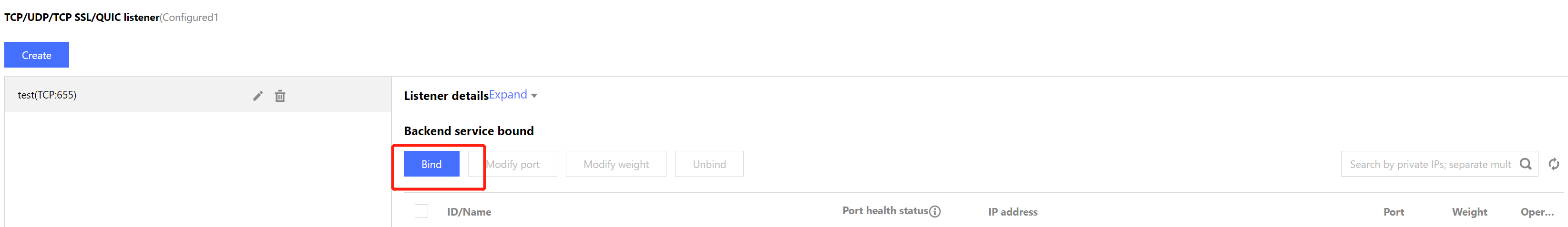 1. After the listener is created, go to the Listener management tab, click the created listener, and then click Bind on the right.