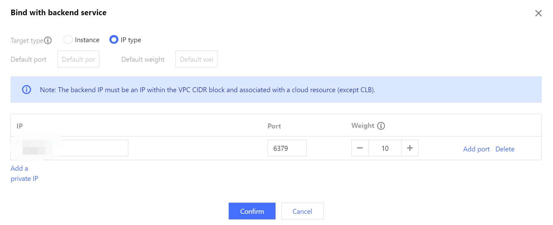 2. In the pop-up dialog, set the Target type to IP type, and enter the IP address and port of the Tencent Cloud Distributed Cache instance in the respective input fields. Click Confirm to complete the binding.