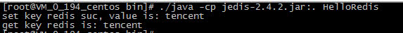 import redis.clients.jedis.Jedis;public class HelloRedis {public static void main(String[] args) {try {/**以下参数,如果为内网访问,分别填写您的 Redis 实例内网 IP、端口号、实例 ID 和密码;如果为外网访问,分别配置实例外网地址、端口号及其密码,无需设置实例 ID*/String host = "192.xx.xx.195";int port = 6379;String instanceid = "crs-09xxxqv";String password = "123ad6aq";//连接 RedisJedis jedis = new Jedis(host, port);//鉴权jedis.auth(instanceid + ":" + password);/**接下来可以开始操作 Redis 实例,可以参考 https://github.com/xetorthio/jedis *///设置 Keyjedis.set("redis", "tencent");System.out.println("set key redis suc, value is: tencent");//获取 KeyString value = jedis.get("redis");System.out.println("get key redis is: " + value);//关闭退出jedis.quit();jedis.close();} catch (Exception e) {e.printStackTrace();}}}
