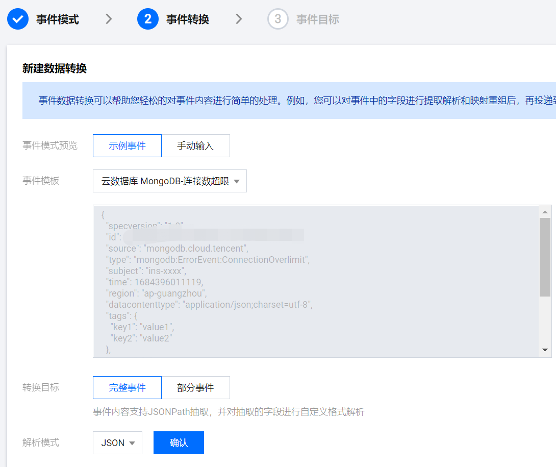 新建数据转换 | 事件模式预览 | 选择示例事件,可使用事件模板; 选择手动输入,可在下方的输入框自定义事件字段。 |
