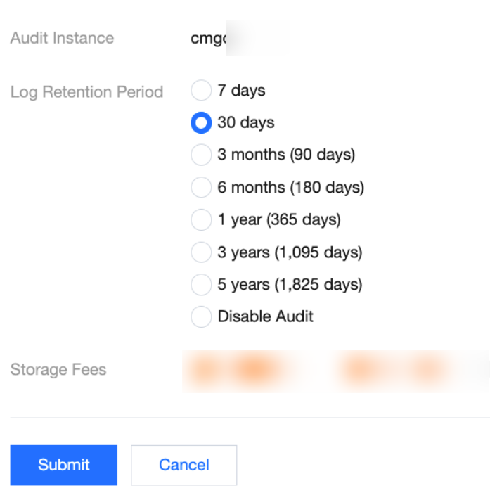 7. In the pop-up dialog box, select Disable Audit next to Log Retention Period, and click Submit.