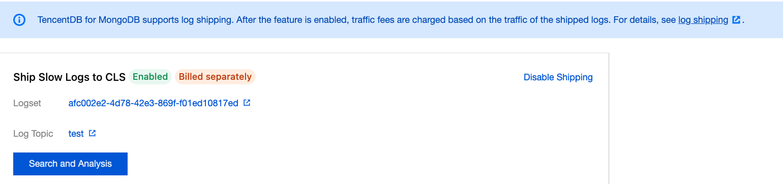 CLS is an independently billed third-party cloud product. When log shipping is enabled for MongoDB, CLS charges traffic fees based on the volume of shipped logs. It supports two billing methods: pay-as-you-go (postpaid) and resource package (prepaid). For detailed billing standards, see CLS Billing Overview. Enabling Log Shipping