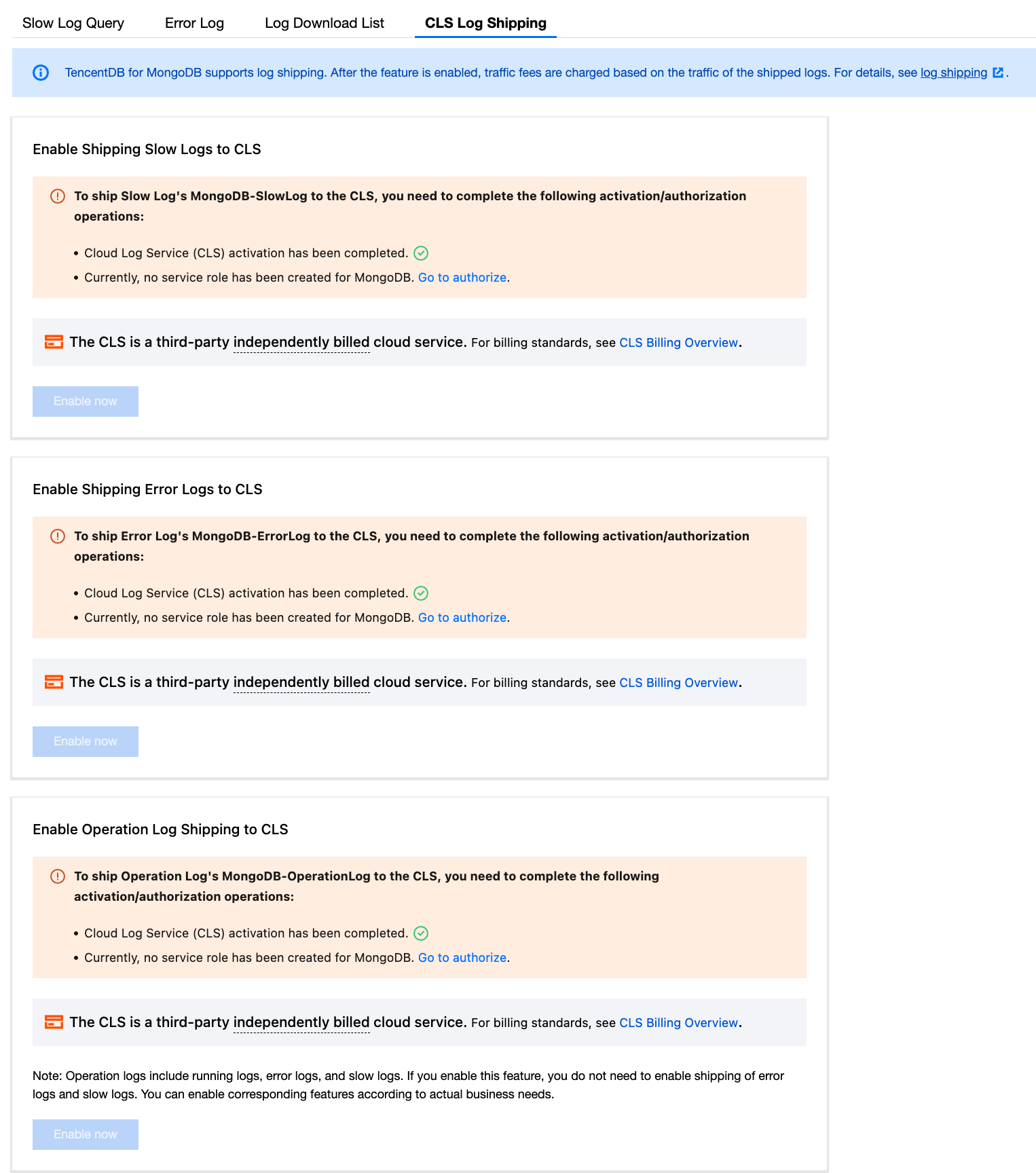 7. MongoDB Log Management automatically detects whether CLS is enabled and whether the service role is authorized. Follow the on-screen prompts to enable the service or grant the required permissions. Slow logs, error logs, and operation logs can be configured individually as needed. For example, to enable slow logs, click Enable now, and in the Enable Log Delivery window, select the log topic and logset for shipping.