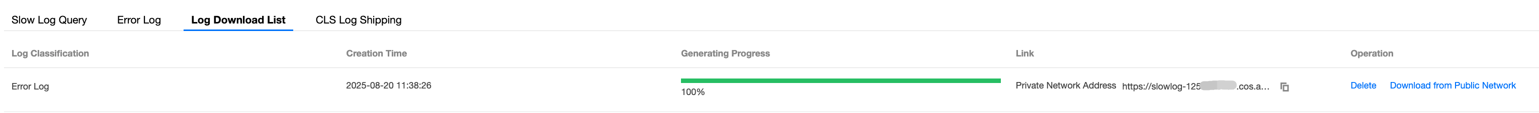 7. Switch to the Log Download List tab to view the generated log files, as shown below. Click public network download to download the log file locally for viewing and analysis.