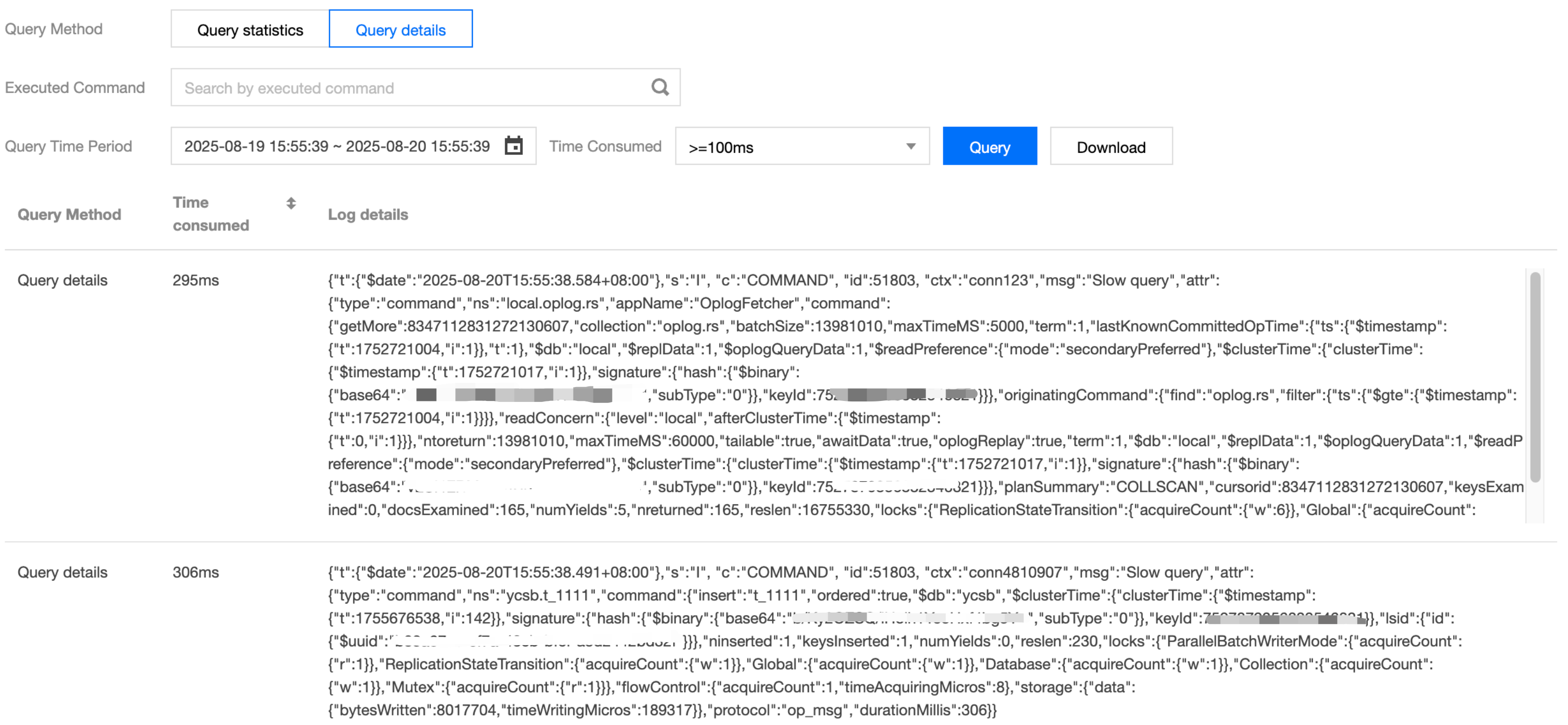 Download slow logs: On the Slow Log Query tab, select Query details under Query Method, set the query command, time range, and execution duration. Click Download to download slow logs within the specified time range.