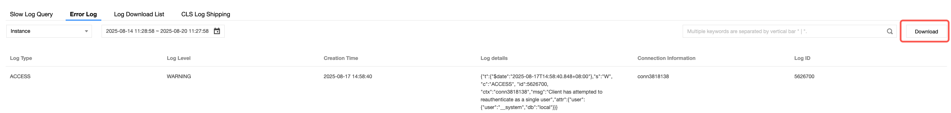 Download error logs: On the Error Log tab, click Download to download error logs within the specified time range.