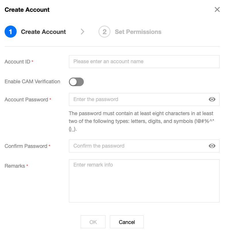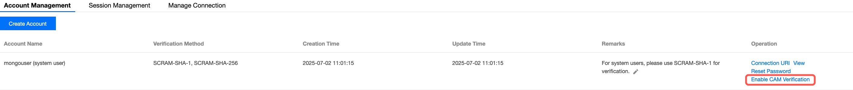 Disabling operation | To disable CAM authentication, a new static password should be set for the account; otherwise, databases cannot be connected. |