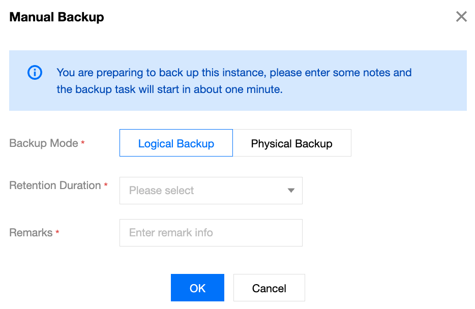 Remarks | In the input box, enter remarks of a string of 30 characters without symbols to identify the business requirements of the manual backup operation. | - |