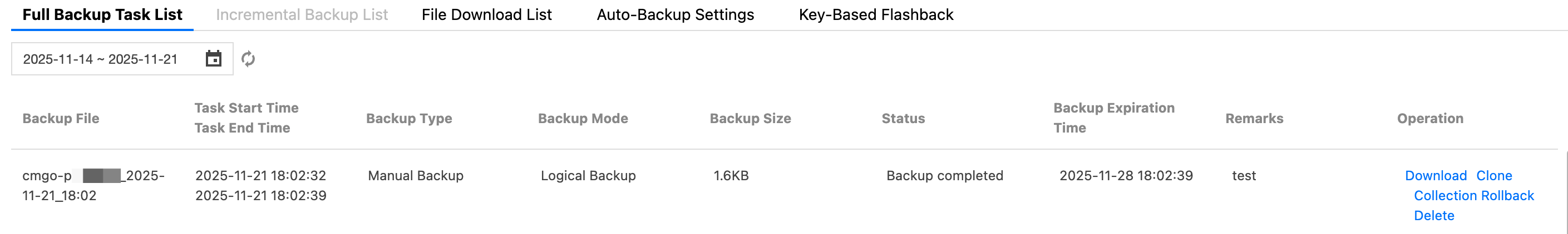 9. After the backup task is completed, you can locate the generated backup files in the full backup task list on the Backup and Rollback page. As shown in the following figure, you can click Download in the Operation column to download the backup files.