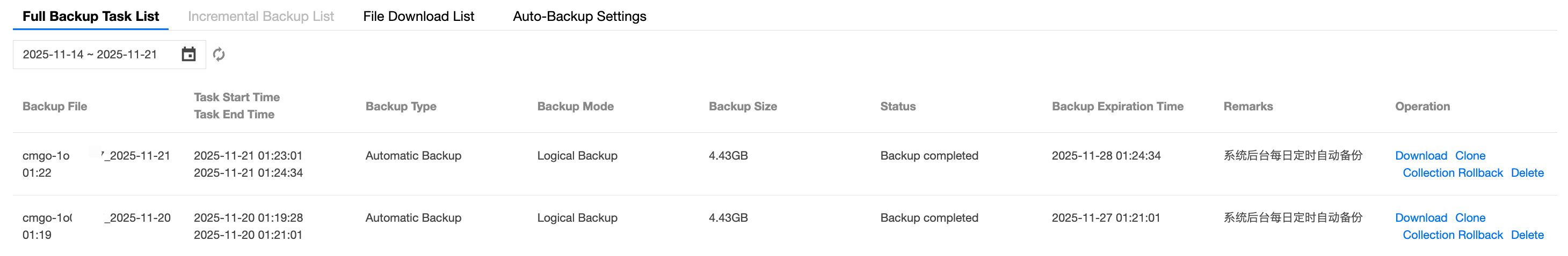 6. Switch to the Backup and Rollback page, and select the Full Backup Task List tab or the Incremental Backup List tab, as shown in the following figure.