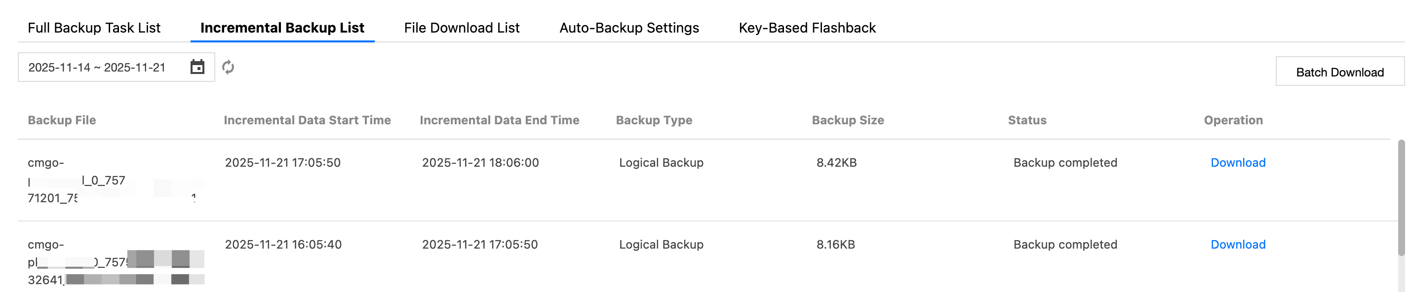 Backup file management view | The backup file list centrally displays the generation records and download progress of all files, and you can directly download or delete files. |