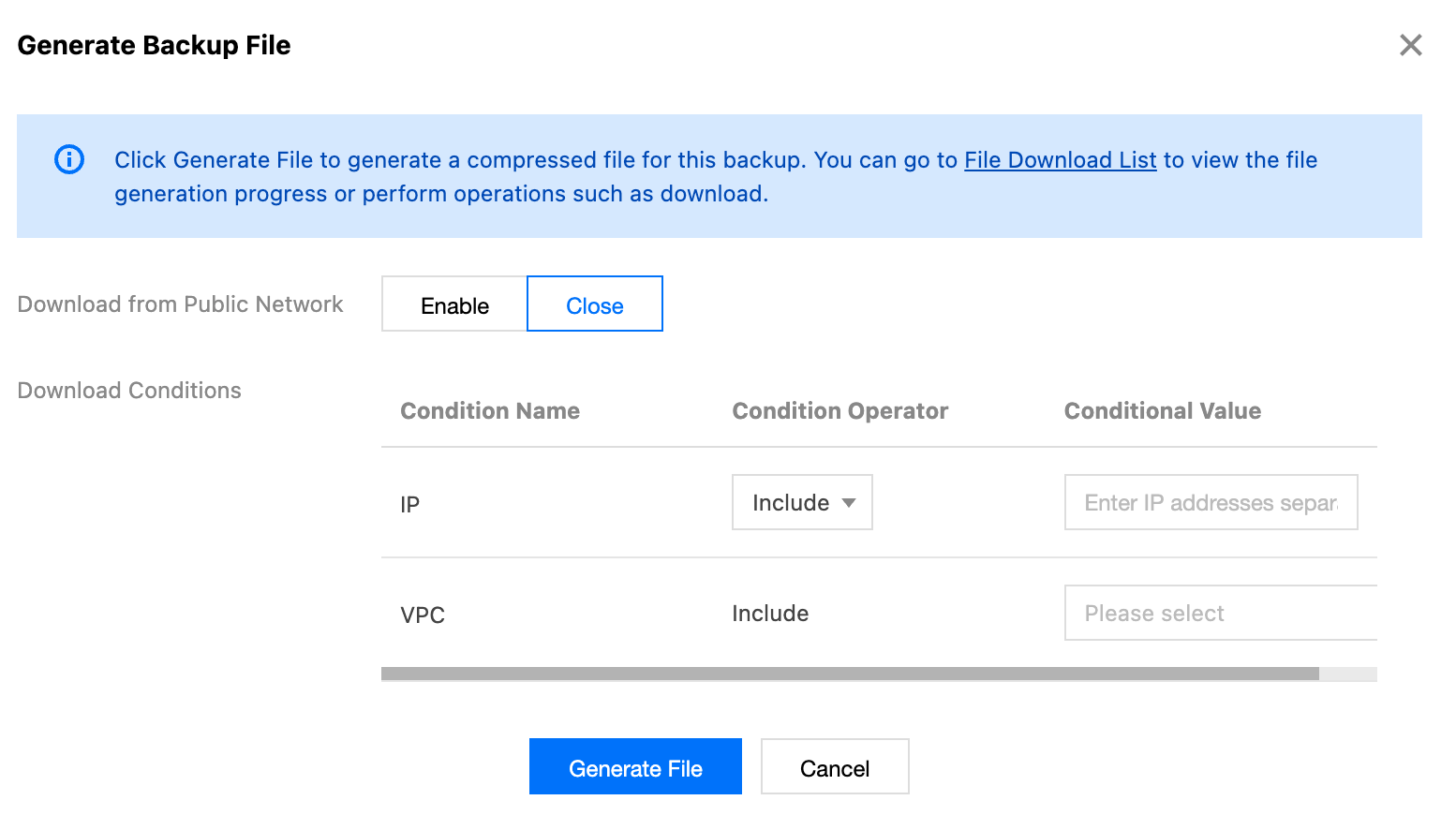 7. In the backup file list, click Download in the Operation column. In the Generate Backup File dialog box, configure the conditions for generating backup files.