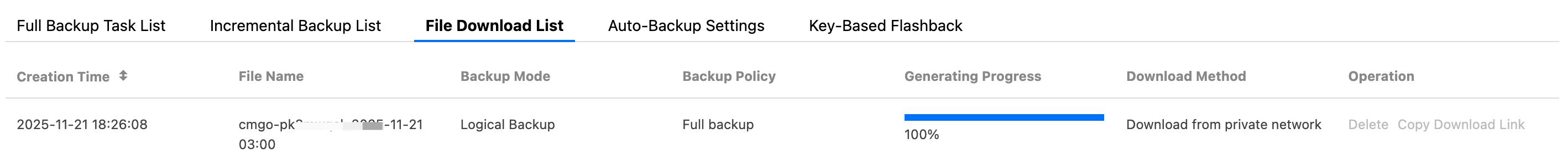 8. Switch to the File Download List tab to view the list of generated backup files. In the Operation column, click Copy Download Link and use the copied link in the browser to directly download backup files.