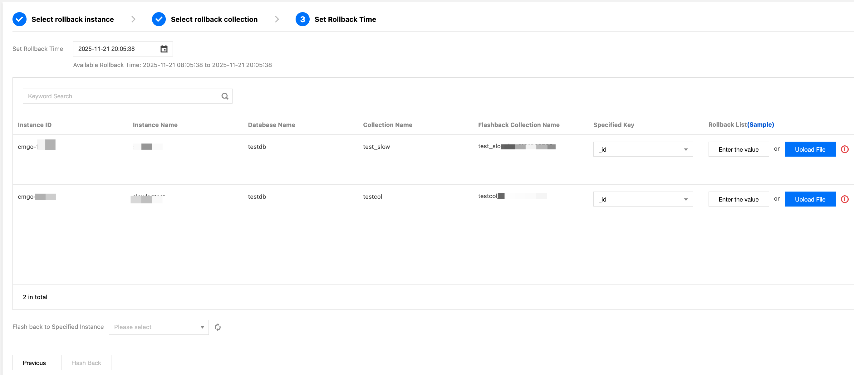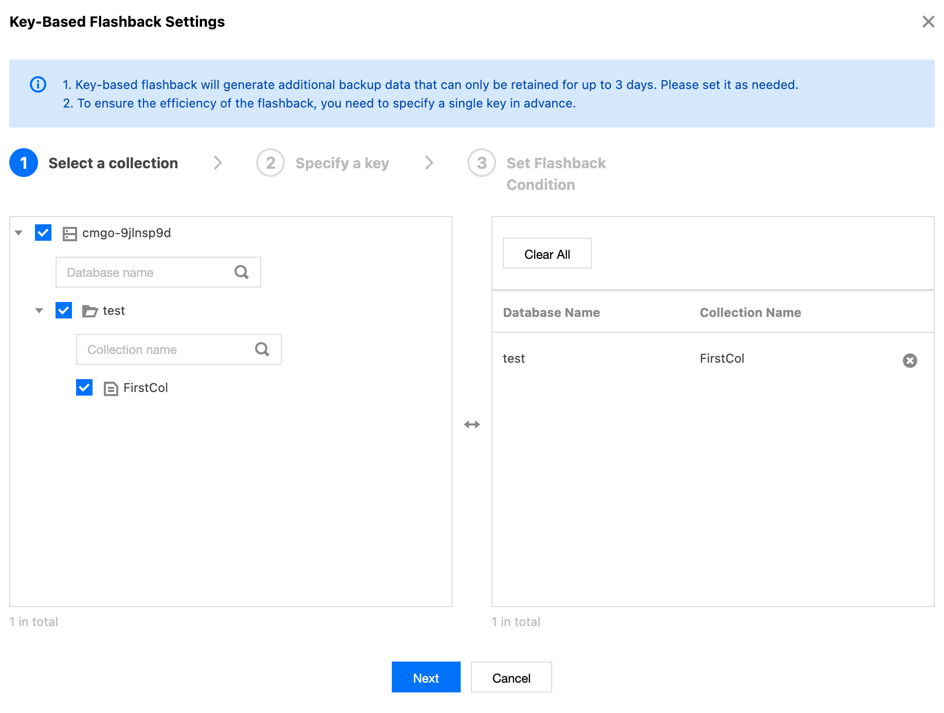 1. Select the Key-Based Rollback tab and click under Key-Based Flashback Settings. 2. On the Select a collection tab under Key-Based Flashback Settings, select one or more databases and tables and click Next, as shown in the following figure.