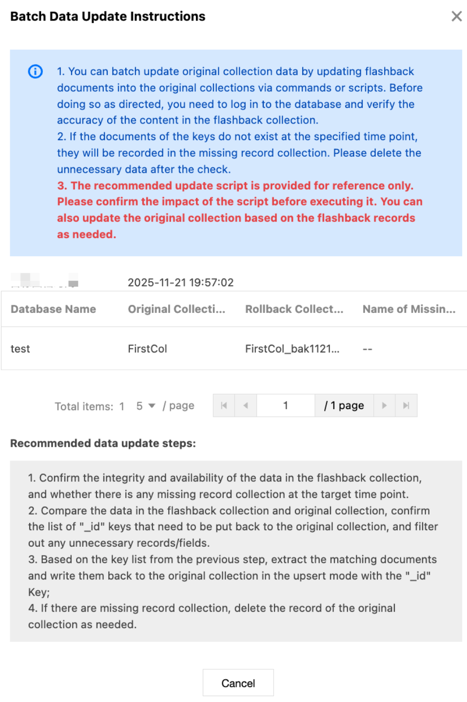 2. On the Rollback Task tab, click Batch Update Data in the Operation column. In the Batch Data Update Instructions window, update original collection data in batches as prompted. For specific update examples, see Batch Data Update Example. Note:
