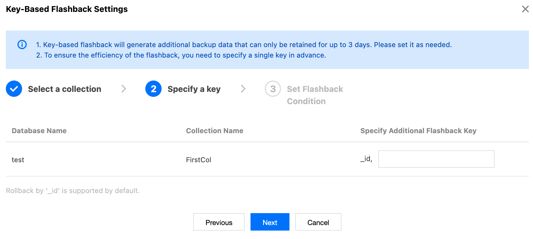 Additional flashback Key refers to setting a specified Key to index the flashback storage. During data flashback, you can quickly retrieve the desired recovery collection based on this designated Key for data recovery. If not specified, the default "_id" Key value is used for flashback.