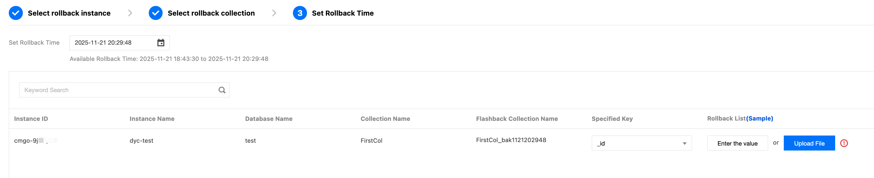 In the Rollback List column, click Enter the value to specify the key values corresponding to the keys of the flashback documents, or click Upload File to upload the key values in a CSV file.