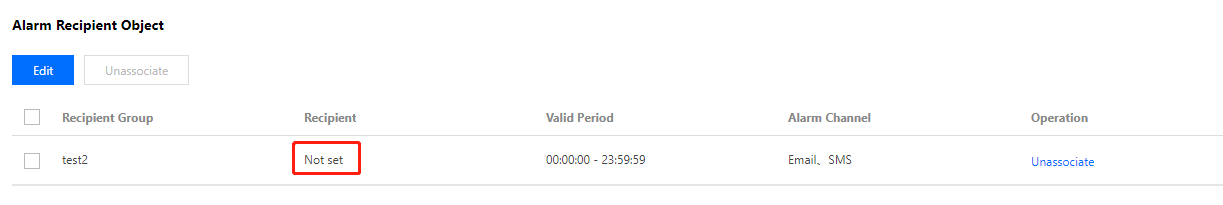 3. Check whether the alarm recipients contain the user who has not received alarm notifications. If the alarm receiving group is "not configured" or does not contain the user, see Creating Alarm Recipient Groups to add the user to the alarm receiving group.