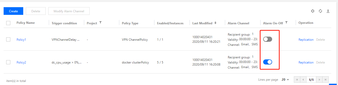 The alarm enable/disable button for policy 2 is blue in the figure below, indicating that the alarm policy is enabled. Proceed to the steps below to continue troubleshooting.