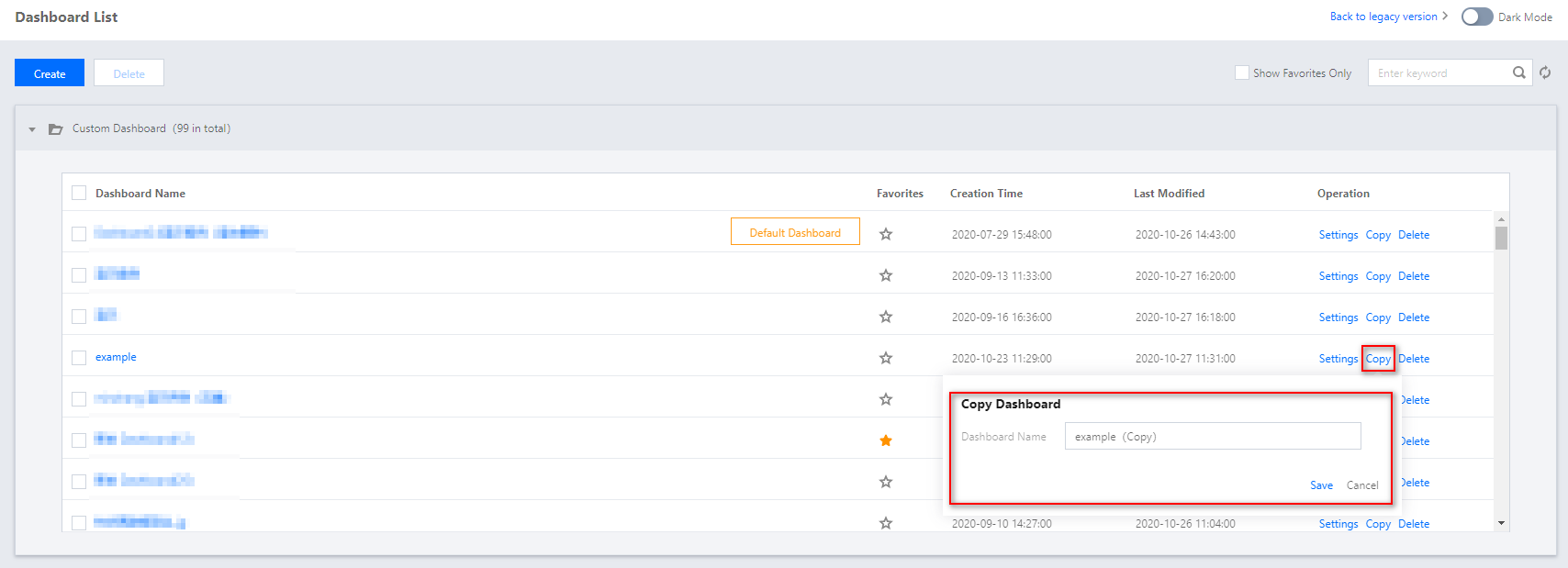 3. In the dashboard list, find the dashboard that you want to copy and click Copy under the “Operation” column.