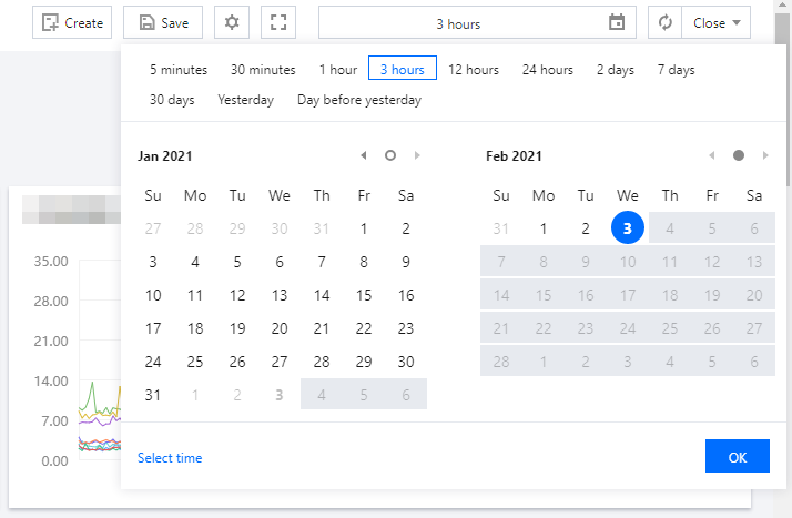 You can adjust the time span and granularity for all charts in the current dashboard by using the time selector in the top-right corner of the dashboard. In this way, you can review historical monitoring data and perform troubleshooting.