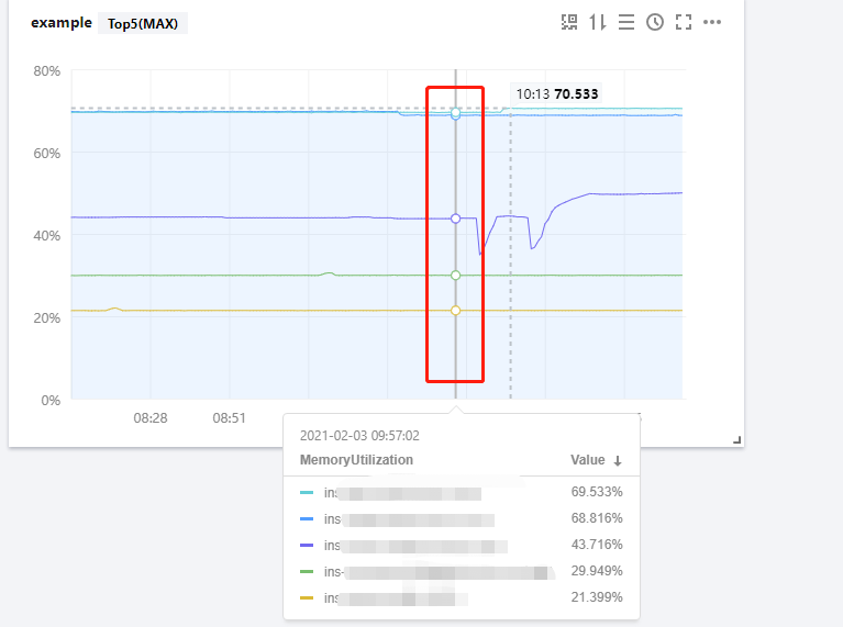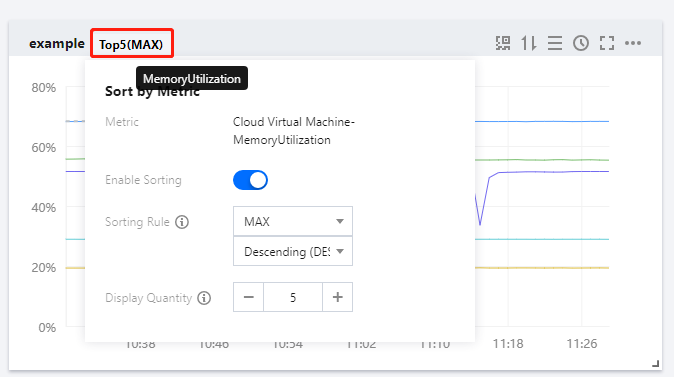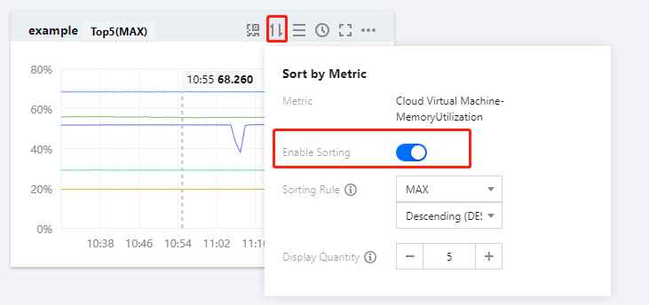 If you enable the sorting feature when creating a metric, you can also click the TopN button in the chart to adjust the sorting rule and display quantity and disable the sorting feature. This makes it easier for you to view the loads of machines in batches.