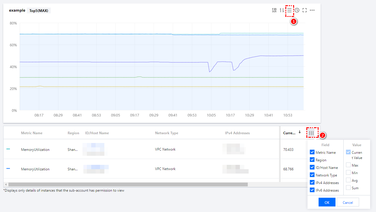 Click the icon (red circle 1 in the figure below) in the top-right corner of the chart to display the instance details. You can also click the icon (circle 2 in the figure below) in the top-right corner of the instance details to select the fields and values to be displayed.