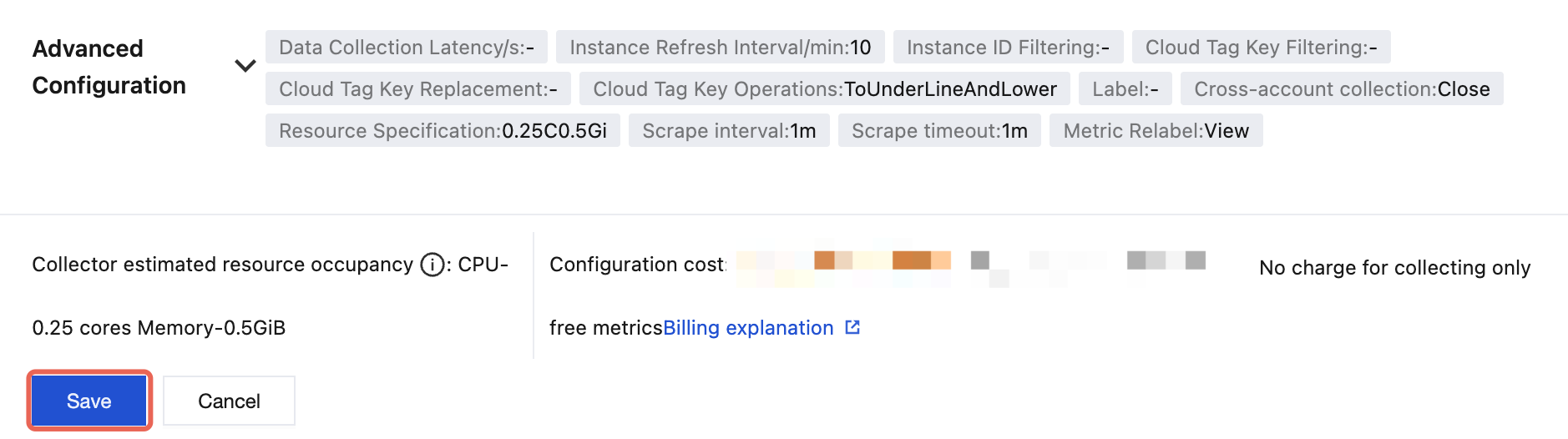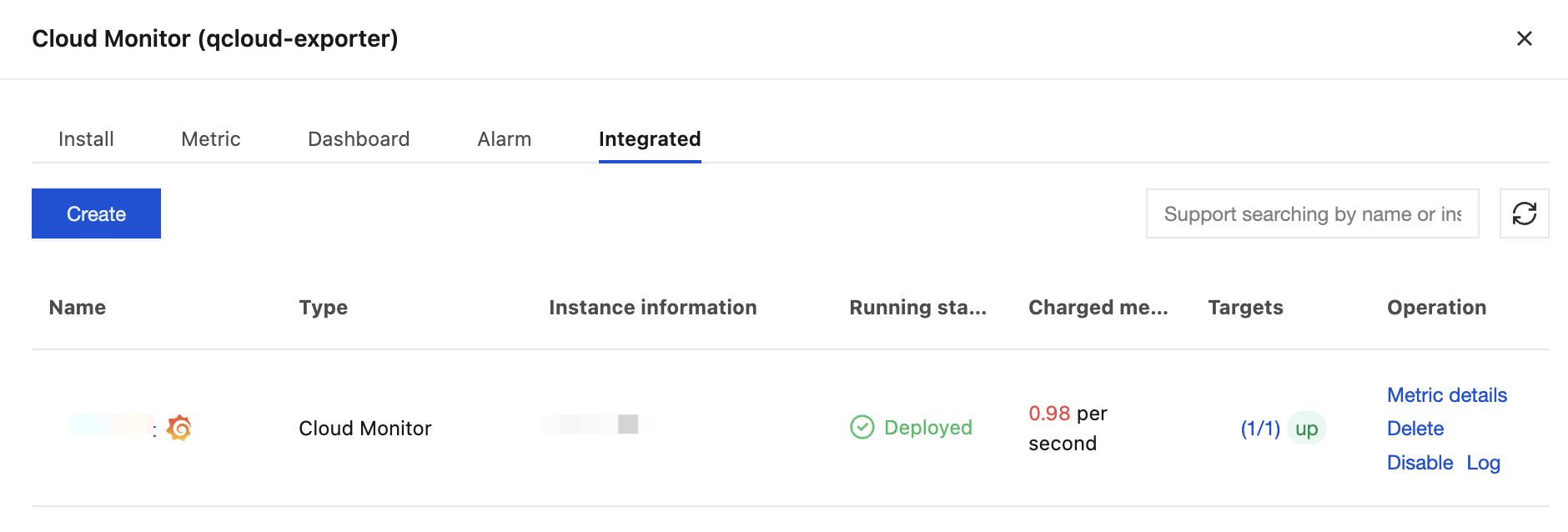 Instance Refresh Interval | Unit: minute. The minimum value is 10. At each instance refresh interval, the integration module will re-pull cloud product instance information. If the instance name or cloud tag is modified or an instance is added or deleted, the monitoring data will be updated within one instance refresh interval. |