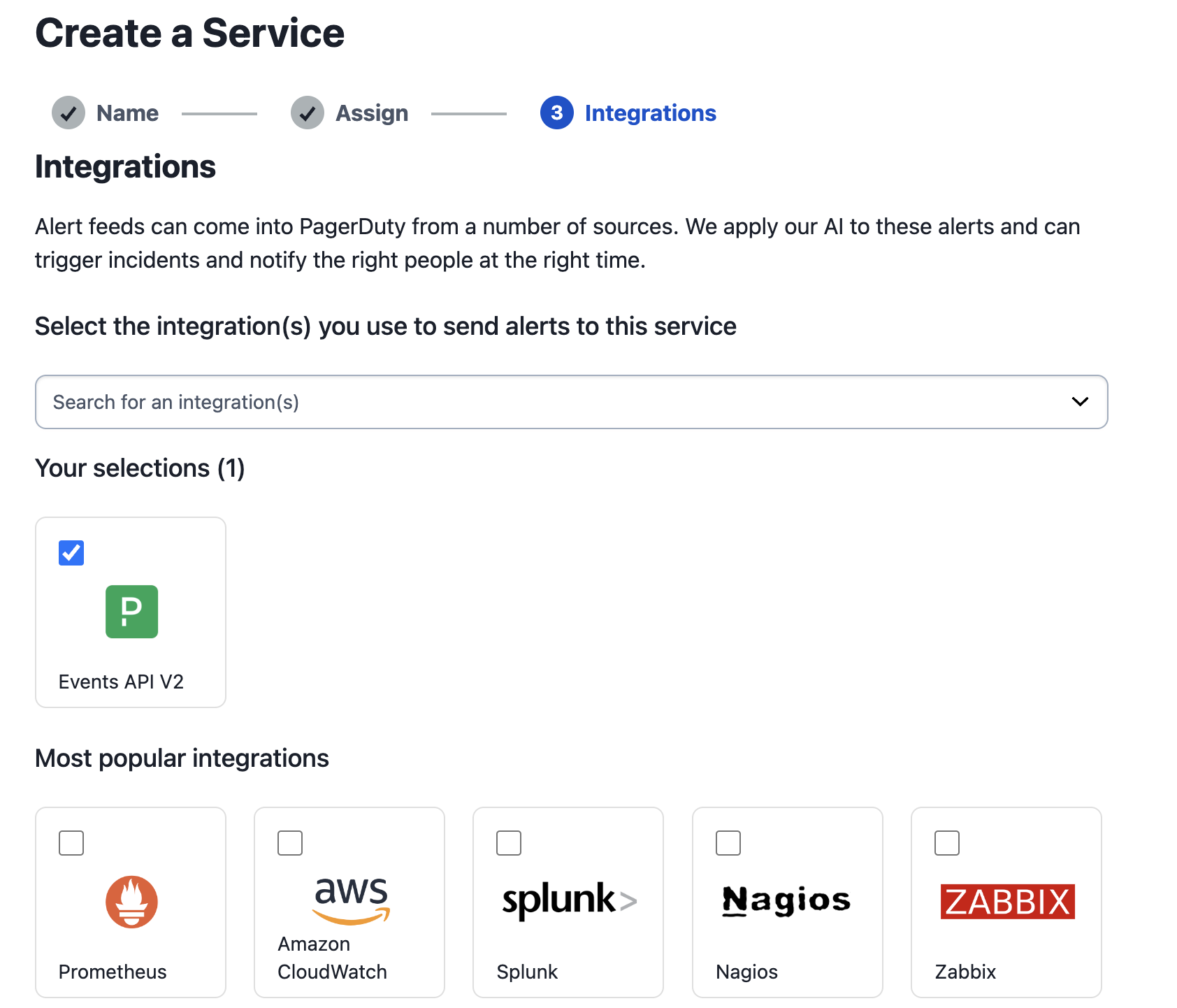 1. Go to the PagerDuty management page and create a service. 2. In the Integrations step, select Events API V2. Currently, only the V2 version is supported. To avoid callback failure, please carefully check whether your selection is correct.