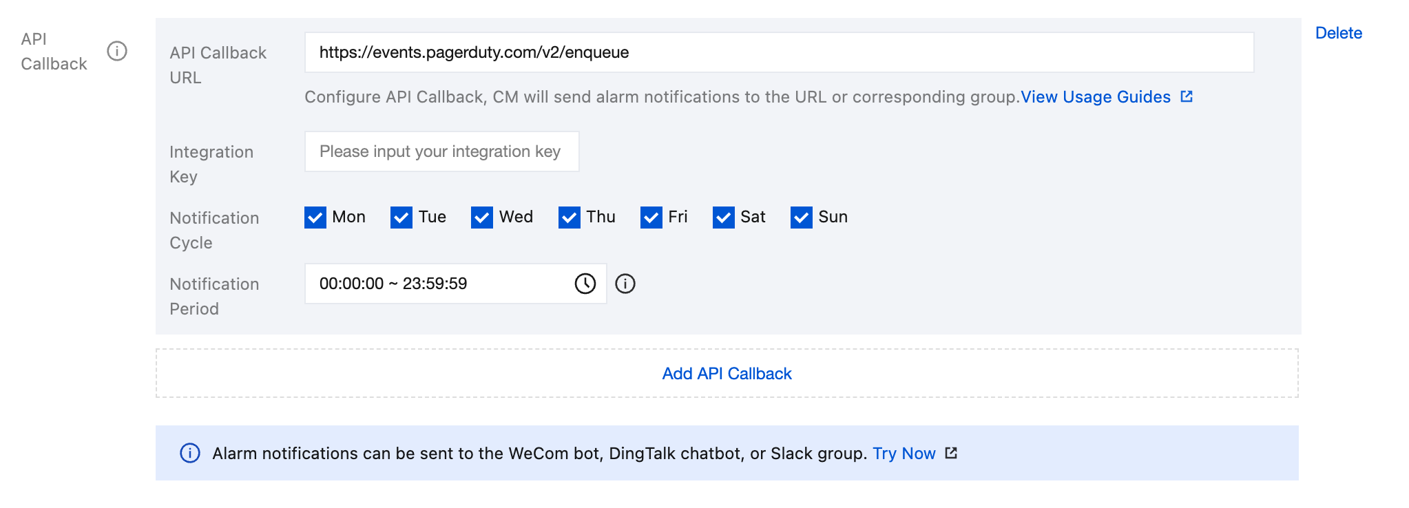 3. After configuring the basic information on the new Notification Template page, fill in the copied Integration Key and Integration URL in the API Callback fields.