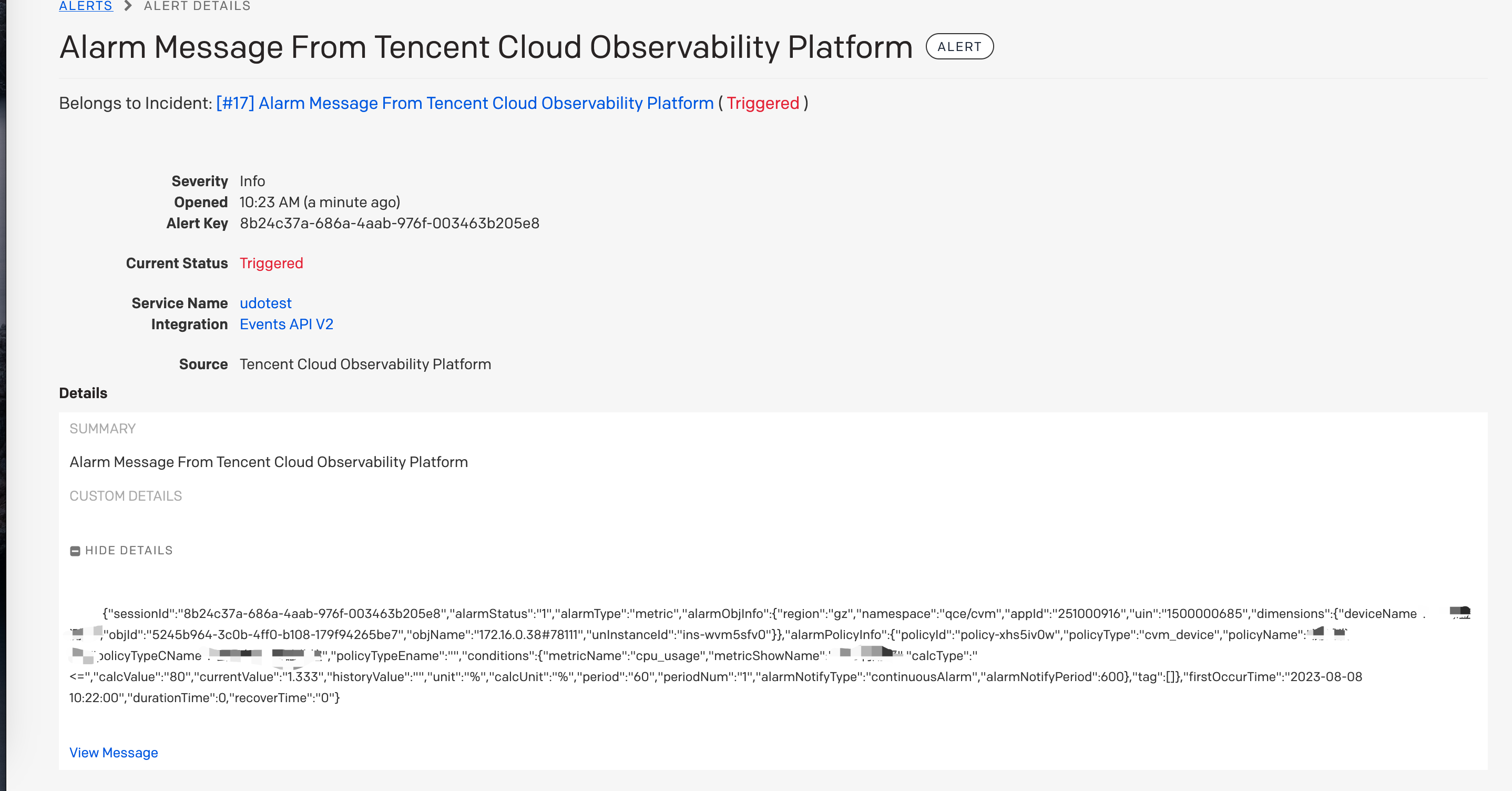 4. After the Alarm Callback configuration is completed, you will receive an alarm callback message from TCOP when the alarm policy is triggered or restored.