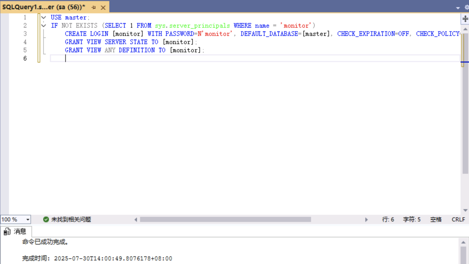 USE master;IF NOT EXISTS (SELECT 1 FROM sys.server_principals WHERE name = 'monitor')CREATE LOGIN [monitor] WITH PASSWORD=N'monitor', DEFAULT_DATABASE=[master], CHECK_EXPIRATION=OFF, CHECK_POLICY=OFF;GRANT VIEW SERVER STATE TO [monitor];GRANT VIEW ANY DEFINITION TO [monitor];