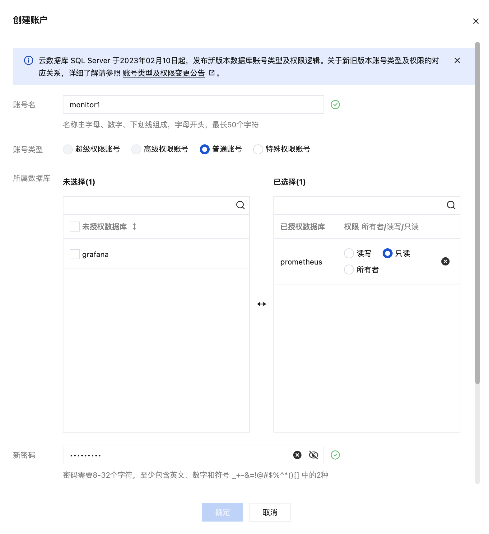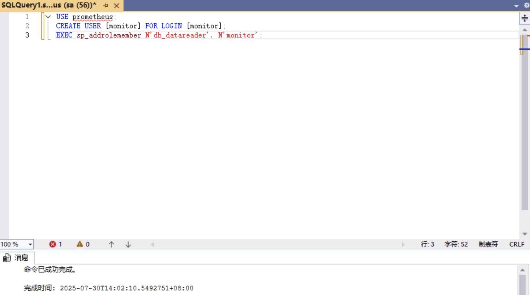 USE prometheus;CREATE USER [monitor] FOR LOGIN [monitor];EXEC sp_addrolemember N'db_datareader', N'monitor';
