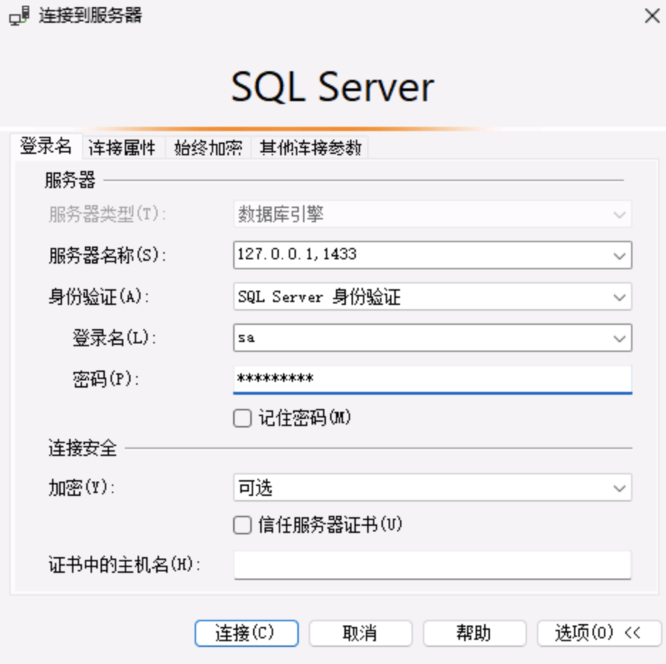 {ip,port} 的形式填写服务器名称,身份验证选择 SQL Server 身份验证,接着填写登录名和密码,加密选择可选,最后单击连接完成数据库服务器的连接。