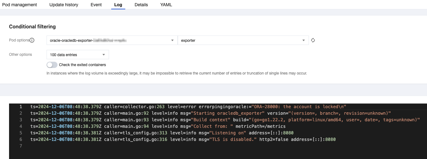 apiVersion: apps/v1kind: Deploymentmetadata:labels:k8s-app: oracledb-exporter # Adjust to the corresponding name based on business requirements. It is recommended to include information about the OracleDB instance.name: oracledb-exporter # Adjust to the corresponding name based on business requirements. It is recommended to include information about the OracleDB instance.namespace: oracledb-demo # Adjust to the corresponding namespace based on business requirements.spec:replicas: 1selector:matchLabels:k8s-app: oracledb-exporter # Adjust to the corresponding name based on business requirements. It is recommended to include information about the OracleDB instance.template:metadata:labels:k8s-app: oracledb-exporter # Adjust to the corresponding name based on business requirements. It is recommended to include information about the OracleDB instance.spec:containers:- args:- --web.listen-address=:8080envFrom:- secretRef:name: oracledb-secret-test # The name of the Secret created in the previous step.image: ccr.ccs.tencentyun.com/rig-agent/common-image:oracledb-exporter-v0.6.0-alpineimagePullPolicy: IfNotPresentname: oracledb-exporterports:- containerPort: 8080name: metricsprotocol: TCPterminationMessagePath: /dev/termination-logterminationMessagePolicy: FilednsPolicy: ClusterFirstimagePullSecrets:- name: qcloudregistrykeyrestartPolicy: AlwaysschedulerName: default-schedulersecurityContext: {}terminationGracePeriodSeconds: 30