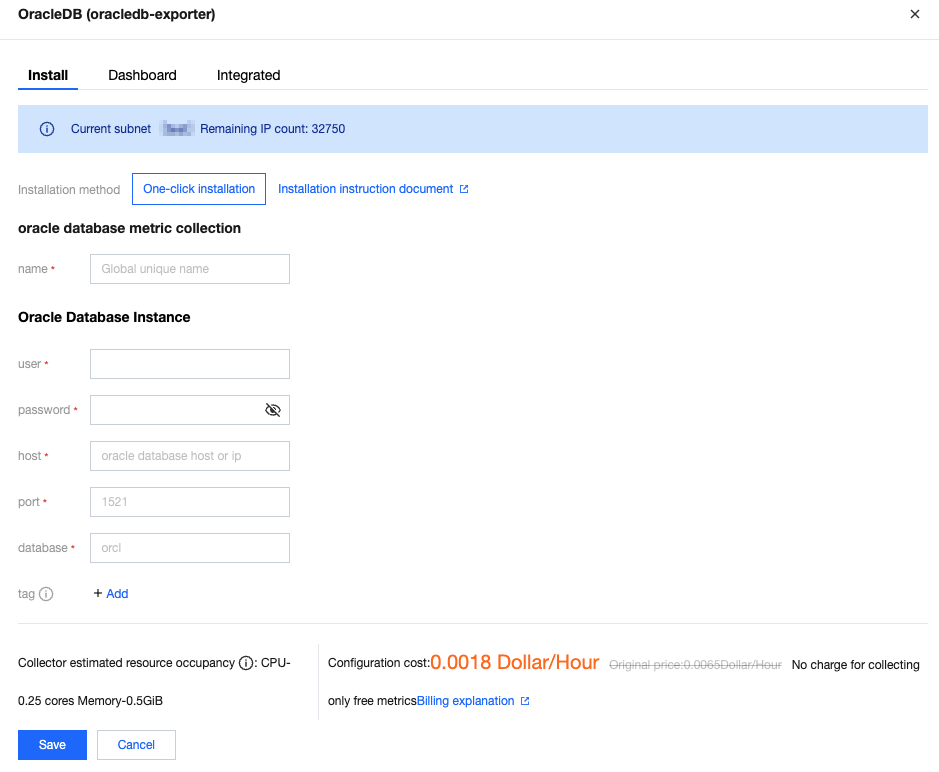 PodMonitor via service discovery to define the collection task. The YAML example is as follows:apiVersion: monitoring.coreos.com/v1kind: PodMonitormetadata:name: oracledb-exporter # Enter a unique name.namespace: cm-prometheus # Pay-as-you-go instance: Use the namespace of the cluster. Monthly subscription instance (no longer available): The namespace is fixed. Do not change it.spec:podMetricsEndpoints:- interval: 30sport: metric-port # Enter the port of the Prometheus Exporter in the Pod YAML file.path: /metrics # Enter the path of the Prometheus Exporter. Default value: /metrics.relabelings:- action: replacesourceLabels:- instanceregex: (.*)targetLabel: instancereplacement: 'crs-xxxxxx' # Replace with the corresponding OracleDB instance ID.namespaceSelector: # Select the namespace where the OracleDB Exporter pod to be monitored is located.matchNames:- oracledb-demoselector: # Enter the labels of the Pod to be monitored to locate the target Pod.matchLabels:k8s-app: oracledb-exporter