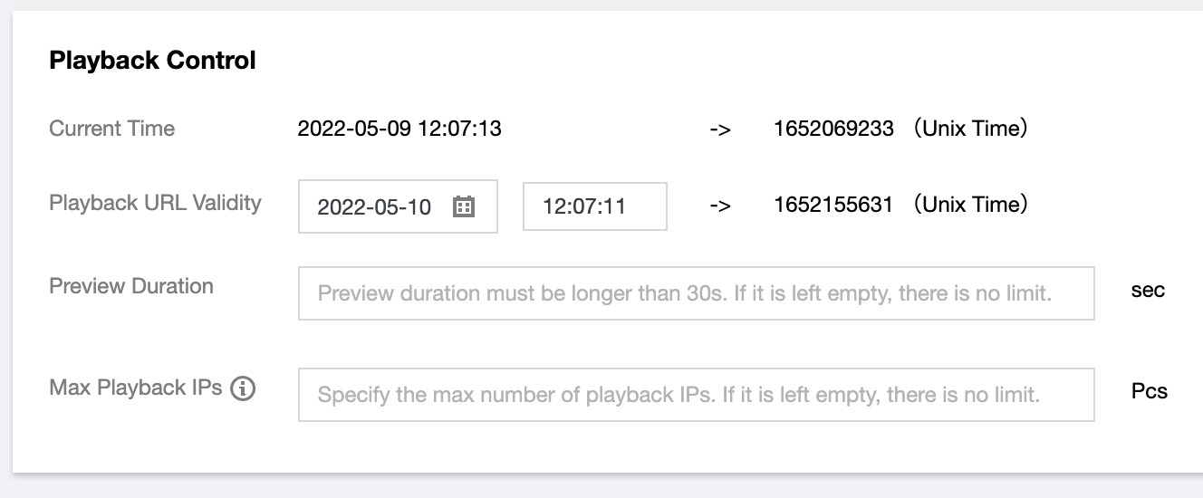3. As hotlink protection is enabled for the default distribution domain name, you can set the hotlink protection expiration time and the preview duration on the Playback Control tab. You can use the default parameter settings here (the default expiration time of playback hotlink protection is one day, and the preview duration and maximum number of IPs allowed for playback are left empty).